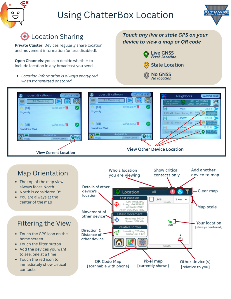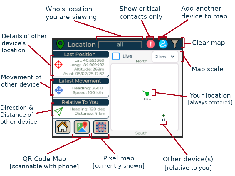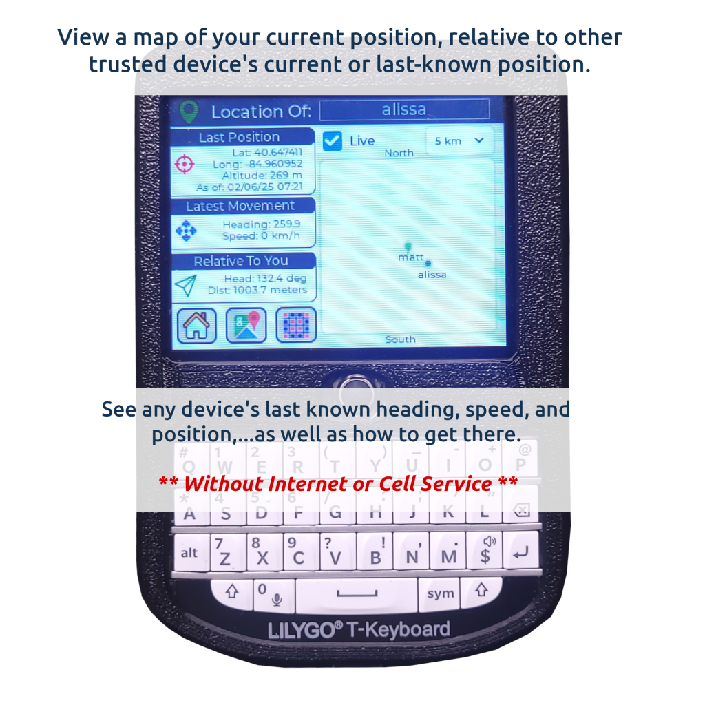 The location screen is useful if you need to know where you and others are, relative to one another. For example, if you are hiking and become separated, this will show each party how to get back to the other, even with no internet connectivity. The relative location you see is based on GPS coordinates from satellites, coordinates exchanged via RF/mesh, and calculations done on your device. This means even off-grid secure mesh location sharing is possible with ChatterBox. The mesh aspect allows devices to propagate locations between devices that are not within immediate reach. Location sharing also happens via MQTT, if enabled.