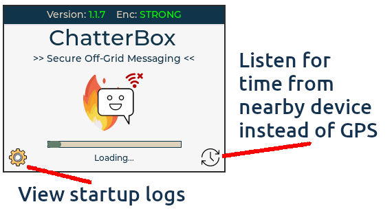When ChatterBox starts up, the first thing it needs to do is figure out the current time. If your device has a built-in realtime clock, this is usually instant. If your device does not have a realtime clock (T-Deck+ does not), it will need to pull the time from either GPS or a nearby ChatterBox. Typically, if you have a good view of the sky, your device can acquire a GPS signal within 10-20 seconds. You can also tap the time button repeatedly until it turns green, which will cause your communicator to listen for time broadcasts from nearby devices. All ChatterBox devices broadcast time periodically by default, so this can definitely speed up your startup time. Any ChatterBox communicator can also push time on demand (in settings menu), which would assist another device during startup.