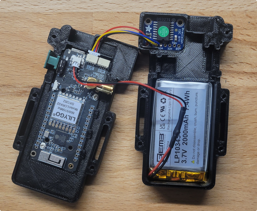 Gather Components![]() | Lilygo T3S3 – SX1262 Version The Stemma version of DS3231 requires no soldering, so you may prefer it. Adafruit DS3231 Stemma OR DS3231 2000 mAh LiPo Battery Qwiic Connector SD Card (optional, recommended) M2 Knurled Nuts M2 Bolts |